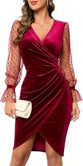 The IHOT Women’s Sexy V Neck Long Sheer Sleeve Velvet Faux Wrap Ruched Sheath Bodycon Dress is a great option for cocktail parties, holiday events, and evening occasions when you want a more elegant and elevated look. The velvet fabric gives the dress a rich feel, while the faux wrap front, ruching, and sheath silhouette help create a flattering shape that feels both stylish and feminine. Buyers who want a dress with a mix of softness, stretch, and dressy detail should appreciate the sheer long sleeves, which add coverage without making the design feel too heavy