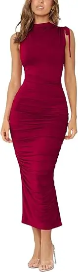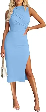 The IHOT Women’s Mock Neck Ruched Bodycon Dress features a sleek midi length, flattering ruching, and a side slit that adds movement and a dressy touch without feeling overdone. Its mock neck and sleeveless design make it a great option for cocktail parties, weddings, dinners, or evening events where you want a polished and elegant look. Buyers who want a fitted dress should appreciate the bodycon silhouette, but checking the size chart carefully is a smart idea to get the best fit